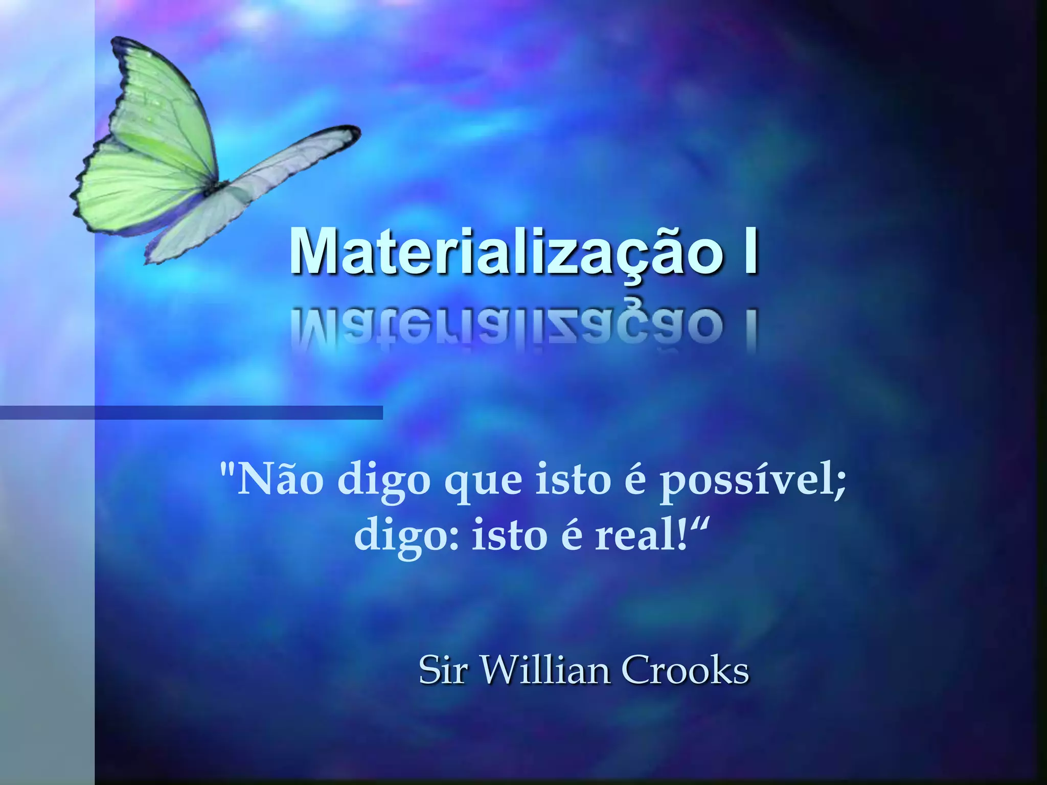 O documento discute o fenômeno da materialização espírita, no qual espíritos se tornam visíveis através do uso de ectoplasma. Detalha os tipos de materialização, como se prepara o ambiente e o médium, e cita pesquisadores como Charles Richet e Sir William Crookes, cujos estudos ajudaram a validar o fenômeno.