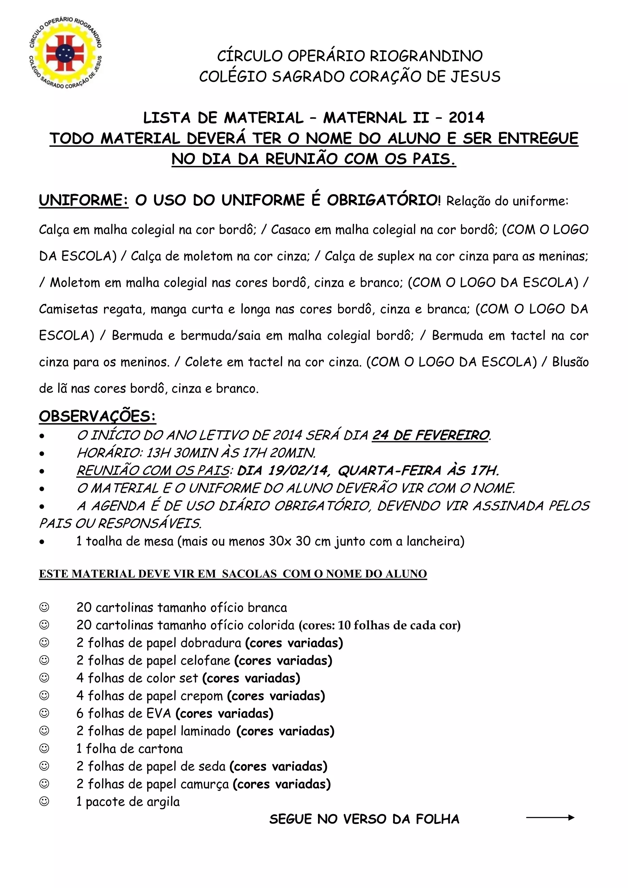 Este documento lista os materiais necessários para os alunos da Maternal II no ano letivo de 2014 em uma escola católica no Rio Grande do Sul. Inclui detalhes sobre o uniforme obrigatório, datas importantes como o início das aulas e reunião de pais, e uma lista extensa de itens escolares e de artes que cada aluno deve trazer, como cartolinas, lápis de cores e massinhas de modelar.