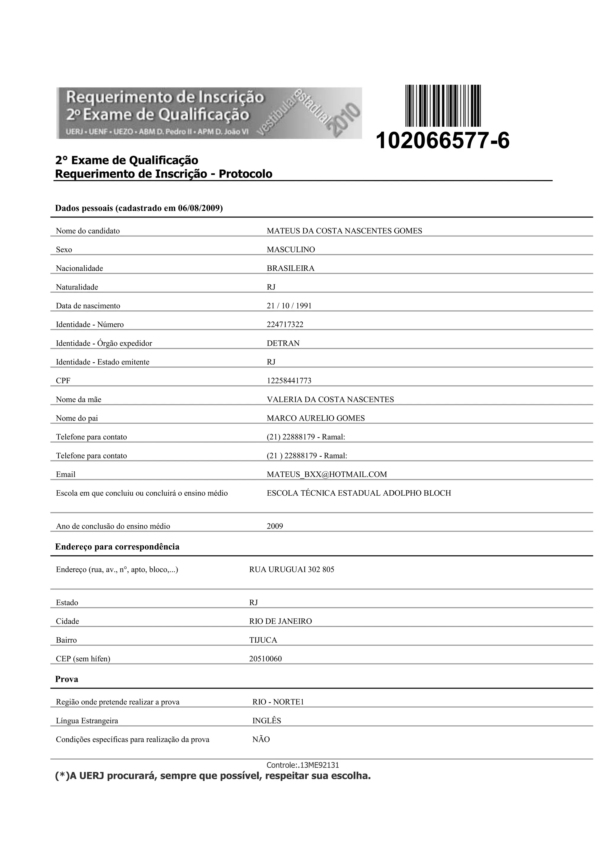 O documento é um requerimento de inscrição para o 2o Exame de Qualificação do Vestibular Estadual 2010 preenchido por Mateus da Costa Nascentes Gomes. Ele fornece seus dados pessoais como nome, data de nascimento, documentos de identidade, endereço, escola de ensino médio e idioma estrangeiro escolhido para a prova. Mateus também declara estar ciente do edital e concordar com seus termos.