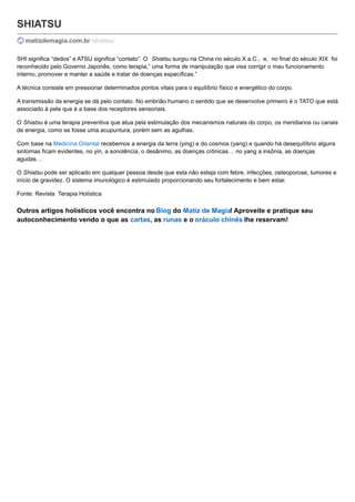 O Shiatsu surgiu na China há mais de 2000 anos e foi reconhecido no Japão como uma terapia no século XIX. Consiste em pressionar pontos vitais para equilibrar o corpo fisicamente e energeticamente, estimulando os meridianos sem usar agulhas. Pode ser aplicado para prevenção e tratamento de desequilíbrios yin-yang, fortalecendo o sistema imunológico e promovendo bem-estar, exceto em casos de febre ou outros problemas de saúde.