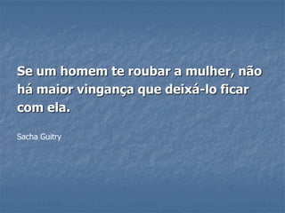 Este documento contém várias citações e piadas sobre relacionamentos e casamento. As citações abordam tópicos como vingança após traição, dificuldades de comunicação no casamento, felicidade dependendo do temperamento da esposa, e a grande pergunta sobre o que as mulheres querem. As piadas giram em torno de aniversários esquecidos, discórdias conjugais, e a constante razão da esposa.