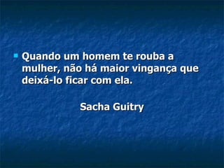 Este documento contém várias citações e piadas sobre relacionamentos e casamento. As citações abordam tópicos como vingança após traição, dificuldades de comunicação no casamento, felicidade dependendo do comportamento da esposa, inspiração versus liberdade das mulheres, e a grande pergunta sobre o que as mulheres querem. As piadas giram em torno de aniversários esquecidos, casais que se conhecem após anos de casamento, e discussões domésticas.