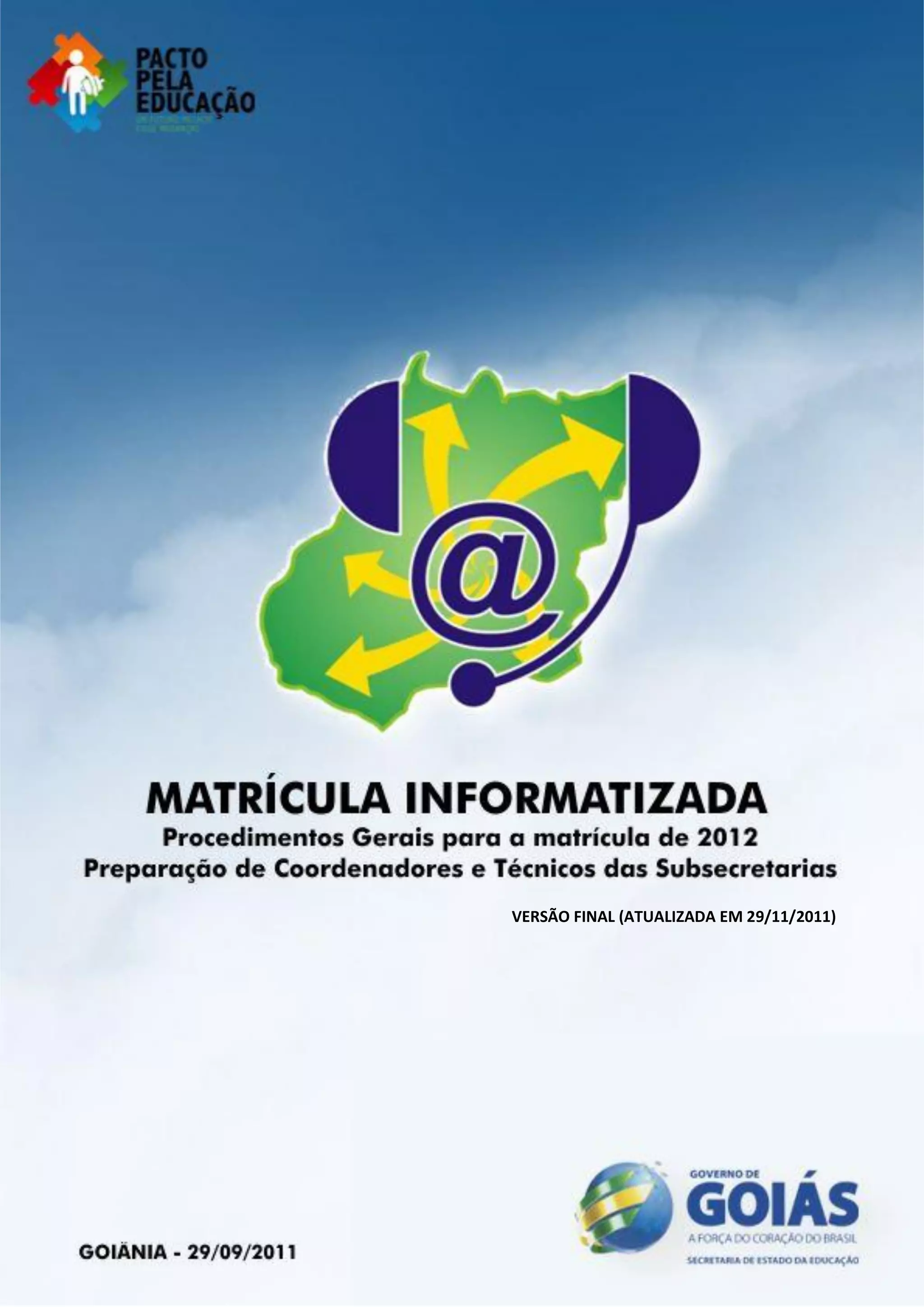 Este documento fornece instruções e cronogramas para o processo de matrícula de alunos na rede estadual de ensino de Goiás para o ano de 2012, incluindo etapas como manutenção de dados, renovação, reordenamento, transferências automáticas e solicitação de novos alunos.