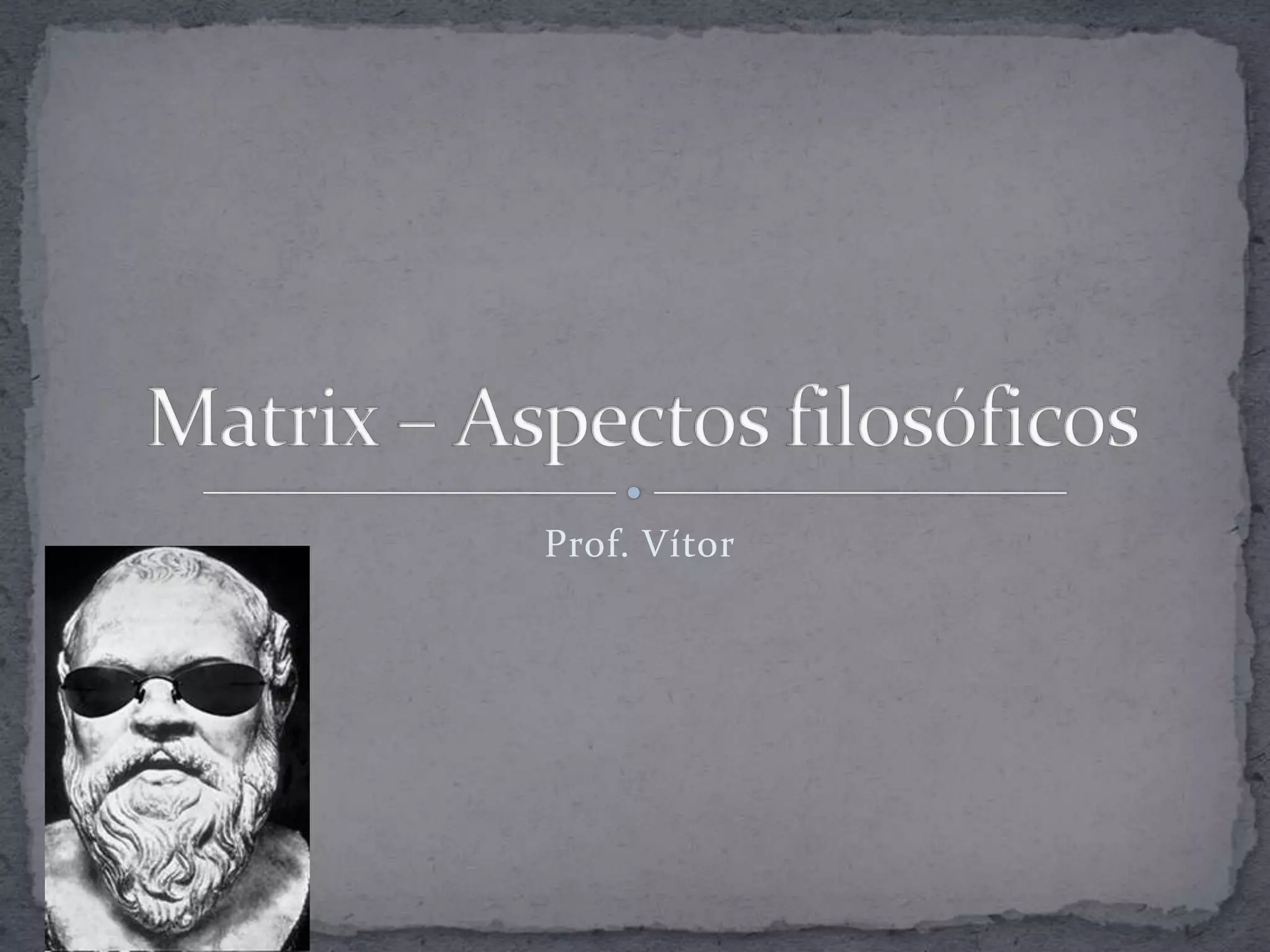O documento discute a diferença entre percepção e realidade a partir do filme Matrix. Apresenta conceitos como a Matrix, Neo, Trinity e Cypher, relacionando-os a temas filosóficos como a Alegoria da Caverna de Platão e o dualismo entre corpo e mente. Questiona se a Matrix retratada no filme se assemelha mais ao mundo sensível platônico ou à visão maniqueísta de que o mal reside na matéria.