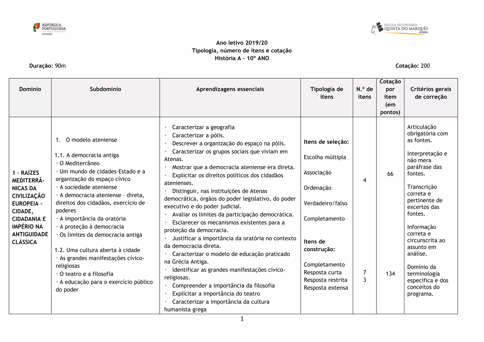 Este documento apresenta a tipologia, número de itens e cotação da prova de História do 10o ano. A prova terá duração de 90 minutos e cotação máxima de 200 pontos. Abordará o tema "Raízes Mediterrânicas da Civilização Europeia" focando no modelo ateniense de democracia e cultura. Conterá itens de seleção e construção avaliando o conhecimento dos alunos sobre a organização política e social de Atenas na Antiguidade Clássica.