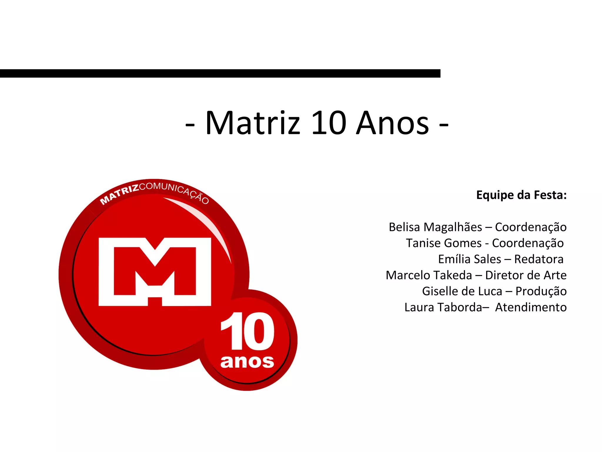 O documento descreve os planos para comemorar o 10o aniversário da Matriz, uma fábrica fictícia de talentos publicitários. A equipe organizadora planeja decorações temáticas de fábrica como placas, empilhadeiras e uniformes de operários para recepcionar os convidados. Haverá também comidas típicas de fábrica, ex-funcionários gravando depoimentos e músicas que marcaram cada geração para ambientar o lounge.