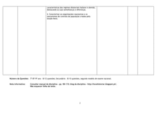 O documento descreve o plano de avaliação para História no 9o ano. Inclui objetivos curriculares relacionados ao fascismo e ditaduras na década de 1930 e a emergência do Estado Novo em Portugal. Detalha sete tipos de itens de avaliação e critérios de classificação, com foco em regimes fascistas na Itália e Alemanha e suas semelhanças e diferenças com o Estado Novo português.