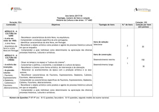 Este documento descreve a tipologia, número de itens e cotação da prova de História da Cultura e das Artes do 11o ano. A prova terá duração de 90 minutos e cotação máxima de 200 pontos. Inclui 7 itens de seleção e 2 itens de construção sobre a Arte Nova, o cinema e movimentos artísticos do início do século XX como Fauvismo e Cubismo. A classificação considera o conteúdo, estrutura, ortografia e correta utilização de fontes.