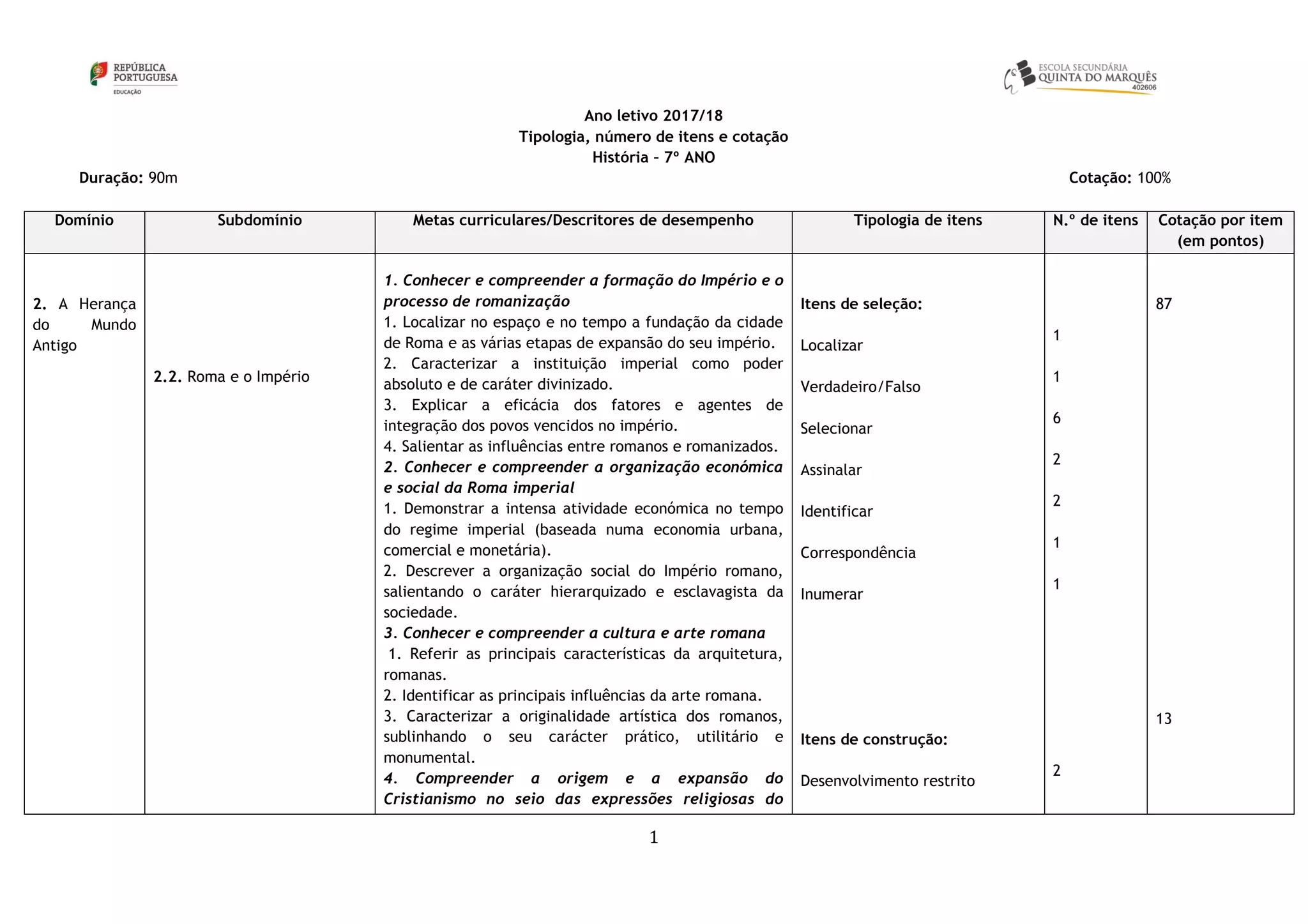 Este documento descreve a tipologia, número de itens e cotação da prova de História do 7o ano. A prova terá uma duração de 90 minutos e será cotada em 100%. Inclui 7 itens sobre o Império Romano, como localizar no mapa a fundação de Roma ou identificar influências da arte romana. A classificação seguirá critérios como anular respostas ambíguas ou com mais de uma alternativa.