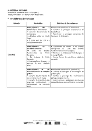 Este documento descreve os detalhes de uma prova escrita de Área de Integração para alunos de cursos profissionais, incluindo a estrutura da prova, critérios de classificação e conteúdos avaliados sobre a construção da democracia portuguesa, cidadania europeia e globalização econômica.