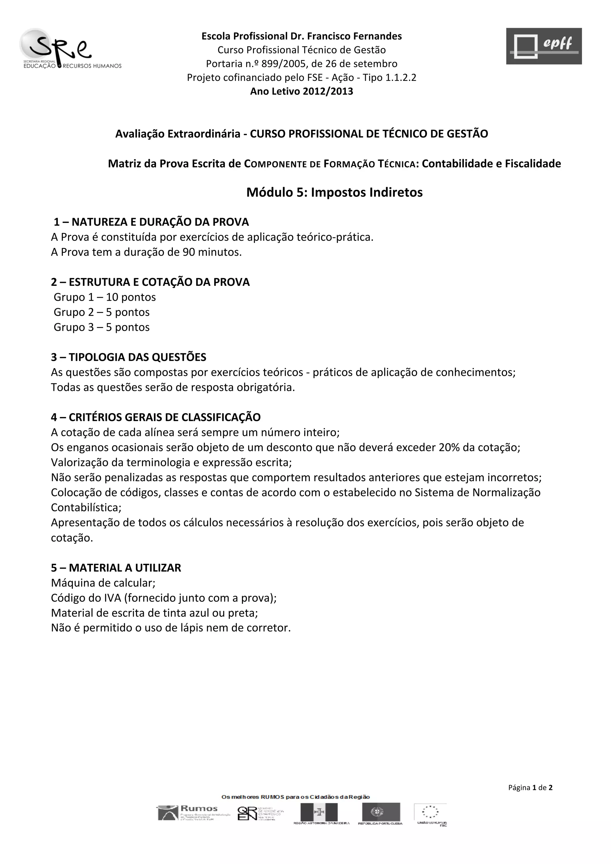 Este documento fornece a matriz de uma prova escrita sobre impostos indiretos para estudantes de um curso técnico de gestão. A prova consiste em exercícios teórico-práticos sobre o IVA e terá a duração de 90 minutos. Será avaliada em 20 pontos e abrangerá conceitos como a natureza do IVA, suas taxas, obrigações fiscais e contabilização.
