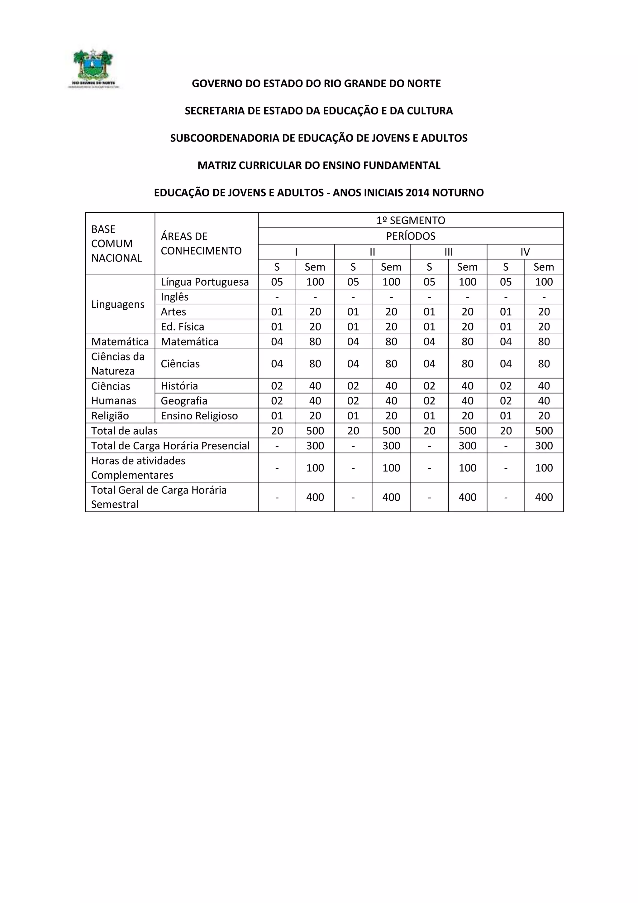 A matriz curricular do ensino fundamental da educação de jovens e adultos do Rio Grande do Norte distribui as disciplinas por áreas de conhecimento ao longo de quatro períodos. A língua portuguesa recebe a maior carga horária com 100 horas em cada período. As demais áreas como matemática, ciências, história e geografia recebem entre 40 e 80 horas a cada período.