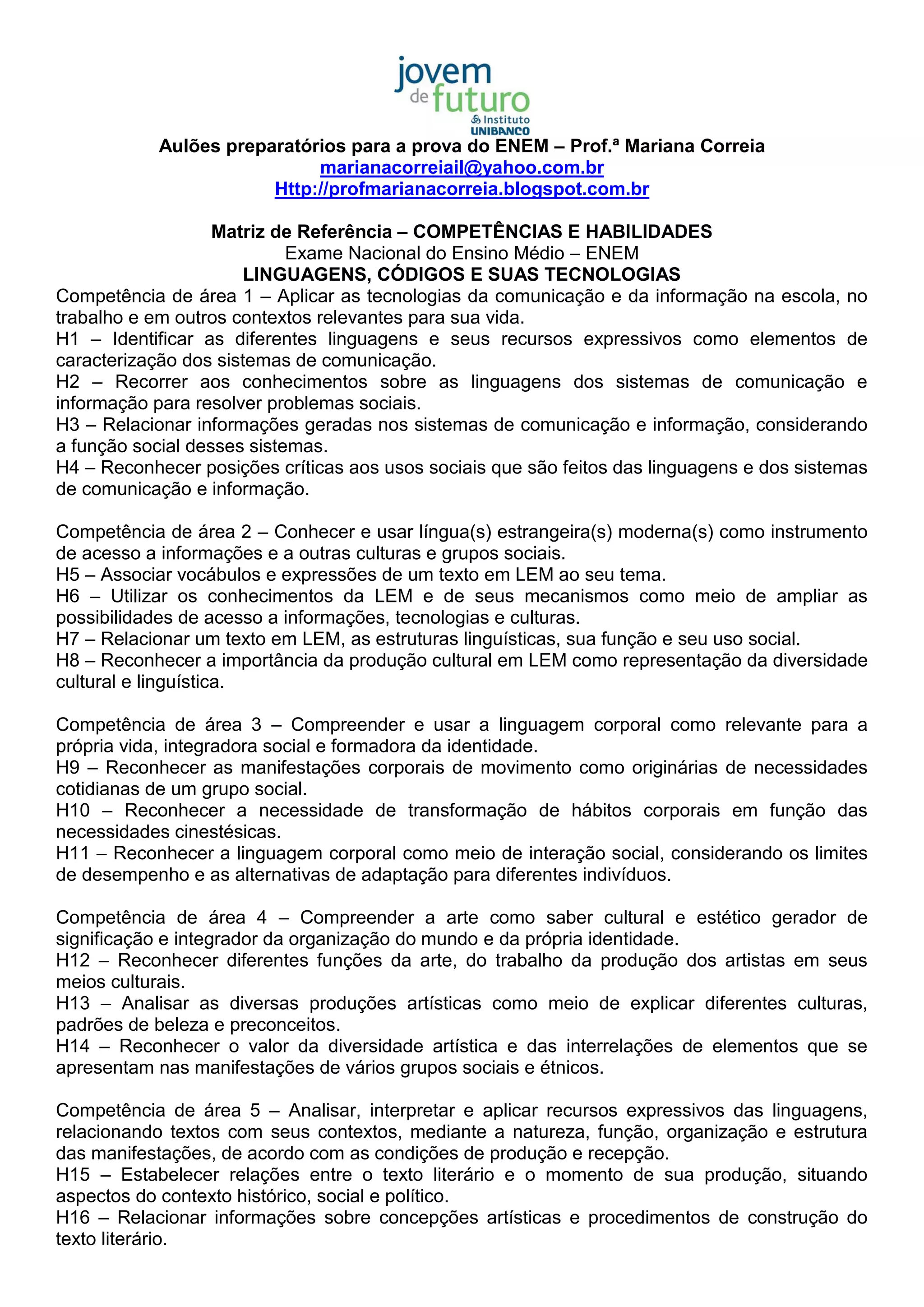 Este documento apresenta uma matriz de referência para as competências e habilidades da prova do ENEM na área de Linguagens, Códigos e Suas Tecnologias. A matriz descreve nove competências de área e associa a cada uma de 2 a 4 habilidades específicas relacionadas ao uso e compreensão de linguagens, sistemas de comunicação e tecnologias da informação.