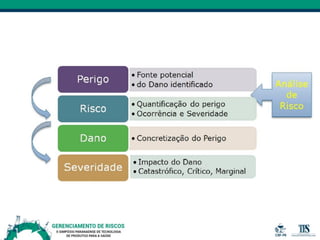 O documento discute o gerenciamento de riscos em dispositivos médicos, descrevendo o processo de: 1) planejamento e análise de riscos, 2) avaliação dos riscos e decisão sobre aceitabilidade, 3) controle de riscos. Inclui uma matriz para classificar riscos baseado em probabilidade e severidade, e um exemplo de reavaliação de risco após reclamações de clientes.