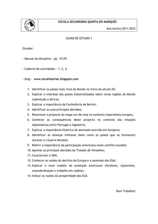 3) O segundo documento é um guia de estudo para o teste, listando tópicos como o imperialismo europeu e a Primeira Guerra Mundial que os estudantes devem estudar.