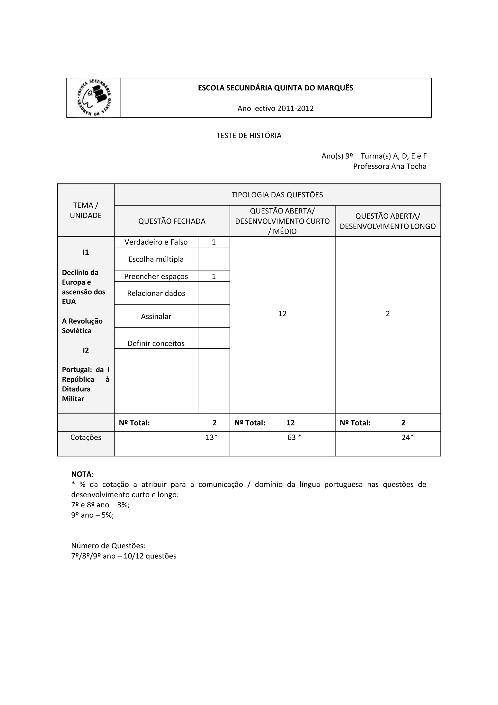 Este documento fornece informações sobre um teste de história para alunos do 9o ano em uma escola secundária portuguesa. O teste cobrirá dois tópicos: 1) o declínio da Europa e a ascensão dos EUA, e 2) Portugal da Primeira República à Ditadura Militar. O teste incluirá questões de escolha múltipla, verdadeiro ou falso, preenchimento de espaços e questões abertas curtas e longas.