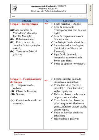 (1) Este documento é uma matriz de avaliação para uma turma do 2o ano letivo de 2011/2012. (2) A avaliação é dividida em duas partes, interpretação de texto e funcionamento da língua, representando cada parte 50% da nota total. (3) A parte de interpretação de texto avalia a compreensão de um texto narrativo através de questões de verdadeiro/falso, escolha múltipla, relacionamento e resposta curta, enquanto a parte de funcionamento da língua avalia conhecimentos de tempos verbais, classes