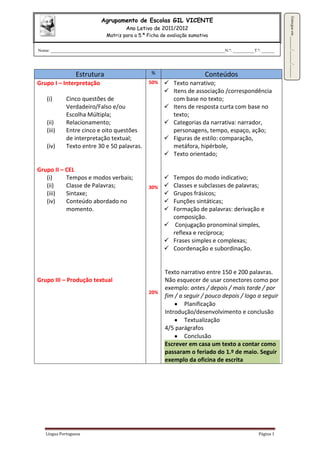 (1) Este documento fornece uma matriz para avaliação sumativa de Português para alunos do 5o ano, (2) Cobrindo interpretação de texto, conhecimento da língua e produção textual, (3) Os alunos serão avaliados em habilidades como compreensão, conjugação verbal e produção de um texto narrativo.