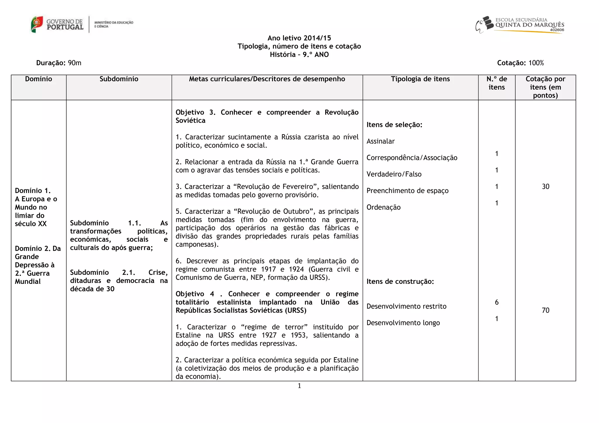 O documento descreve o plano de avaliação para História no 9o ano, incluindo objetivos, tipos de questões e critérios de classificação. Cobre tópicos como a Revolução Russa, o regime stalinista na URSS e o Estado Novo em Portugal. Inclui 8 questões sobre esses tópicos com diferentes formatos como escolha múltipla, correspondência e ordenação.