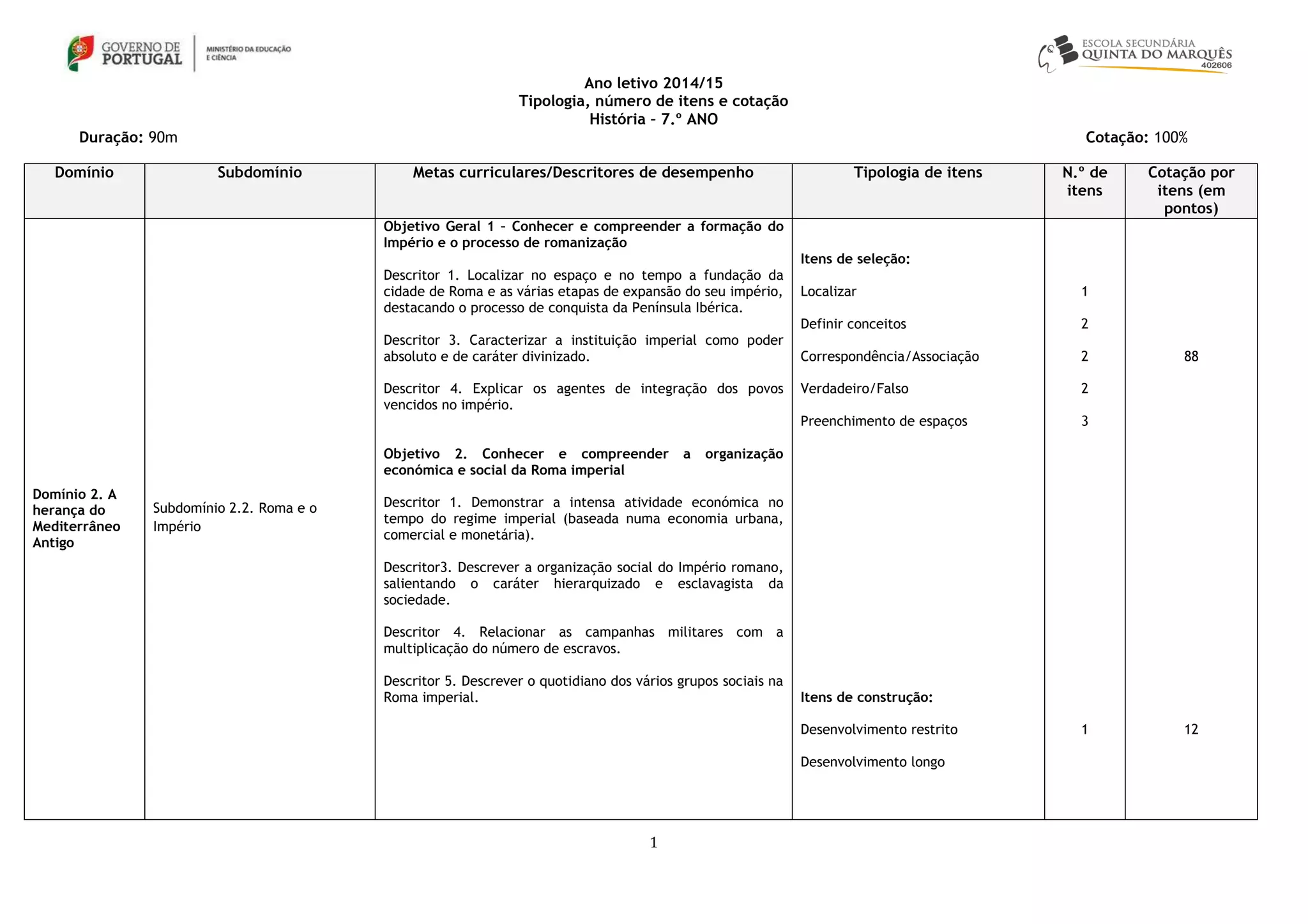 Este documento descreve a tipologia, número de itens e cotação da prova de História do 7o ano. A prova terá 8 a 12 questões e focará nos objetivos curriculares relacionados ao Império Romano e sua expansão, organização econômica e social. A prova incluirá itens de seleção múltipla, correspondência e desenvolvimento curto ou longo, e será classificada de acordo com critérios como correção das respostas e uso apropriado de fontes.