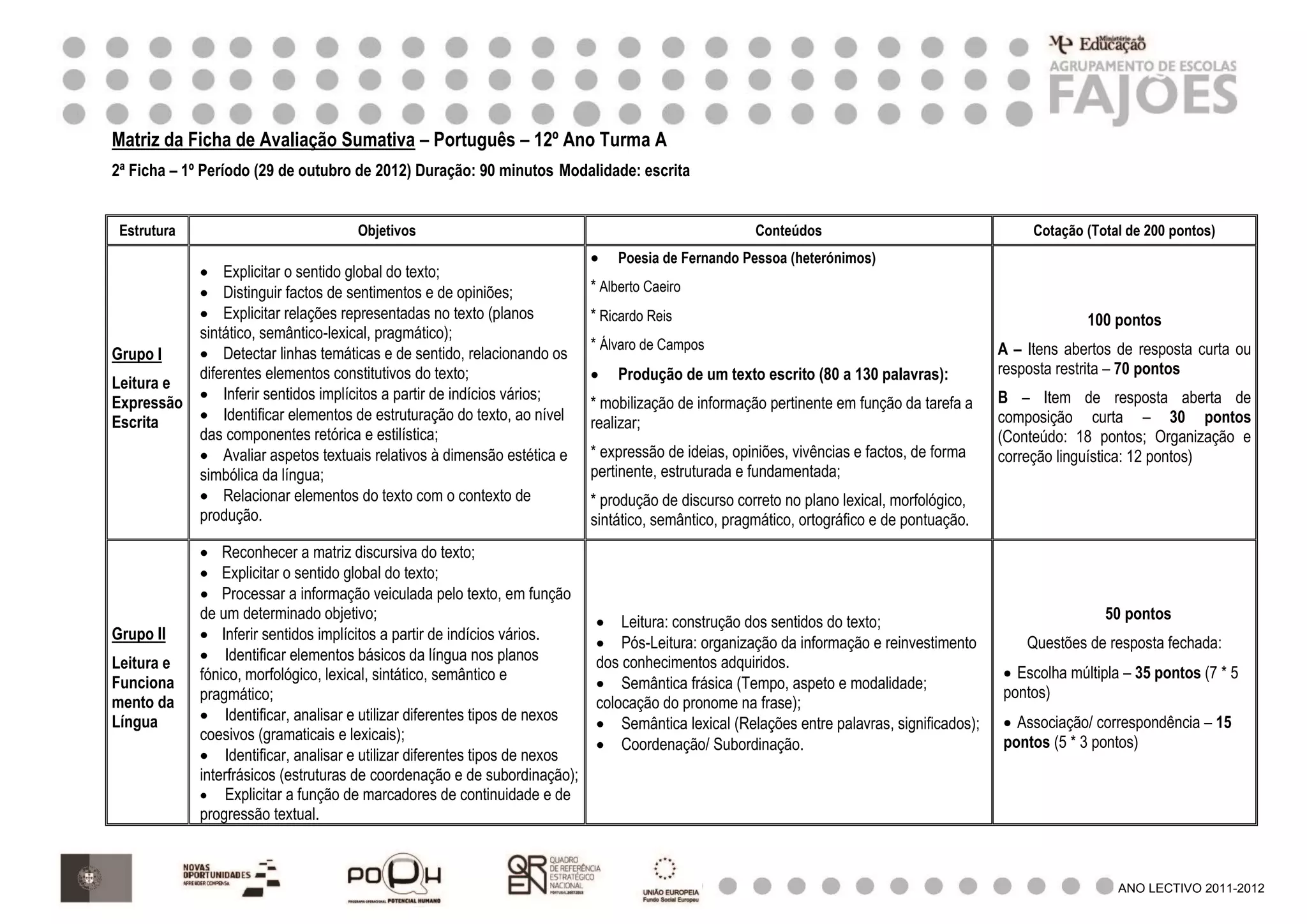 Matriz da Ficha de Avaliação Sumativa – Português – 12º Ano Turma A