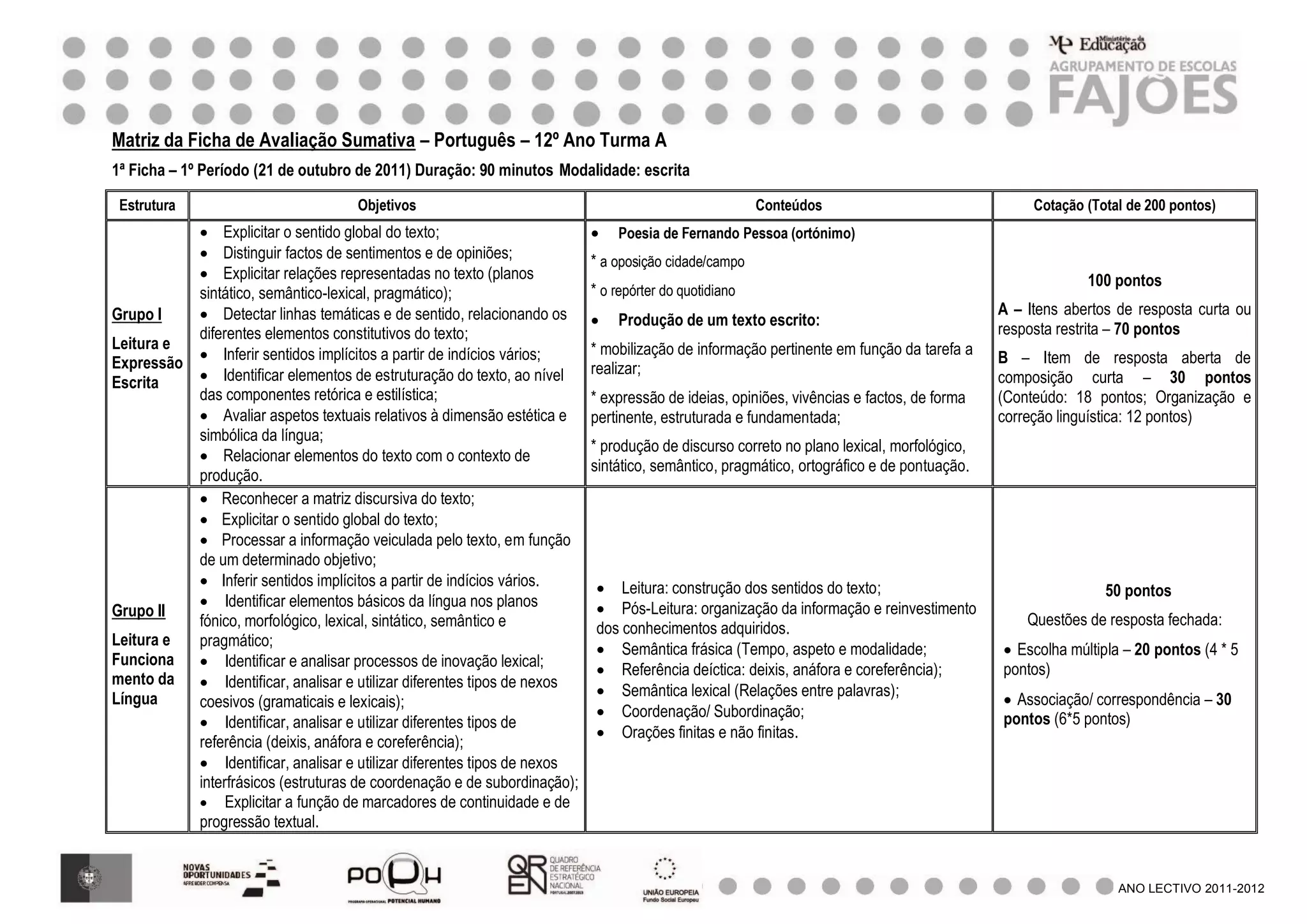 Este documento apresenta a matriz de avaliação de uma prova de Português do 12o ano com 3 grupos. O Grupo I avalia a leitura e expressão escrita com ênfase na compreensão e produção de textos. O Grupo II avalia a leitura e funcionamento da língua com questões sobre semântica e sintaxe. O Grupo III avalia a expressão escrita focando na estruturação temática, discursiva e correção linguística.