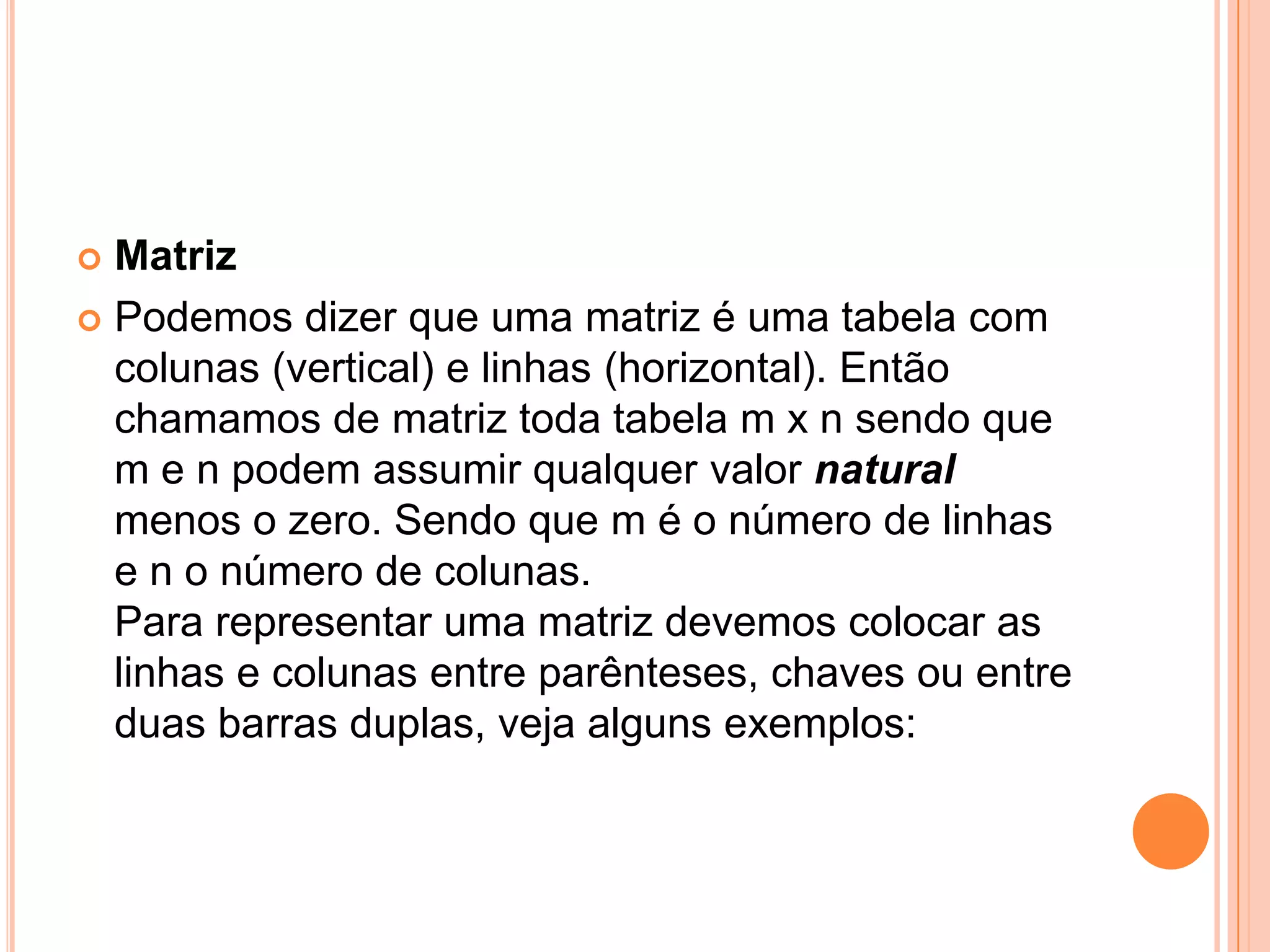 3) Podemos realizar operações com matrizes como soma, subtração e multiplicação seguindo regras de ordem das linhas e colunas.