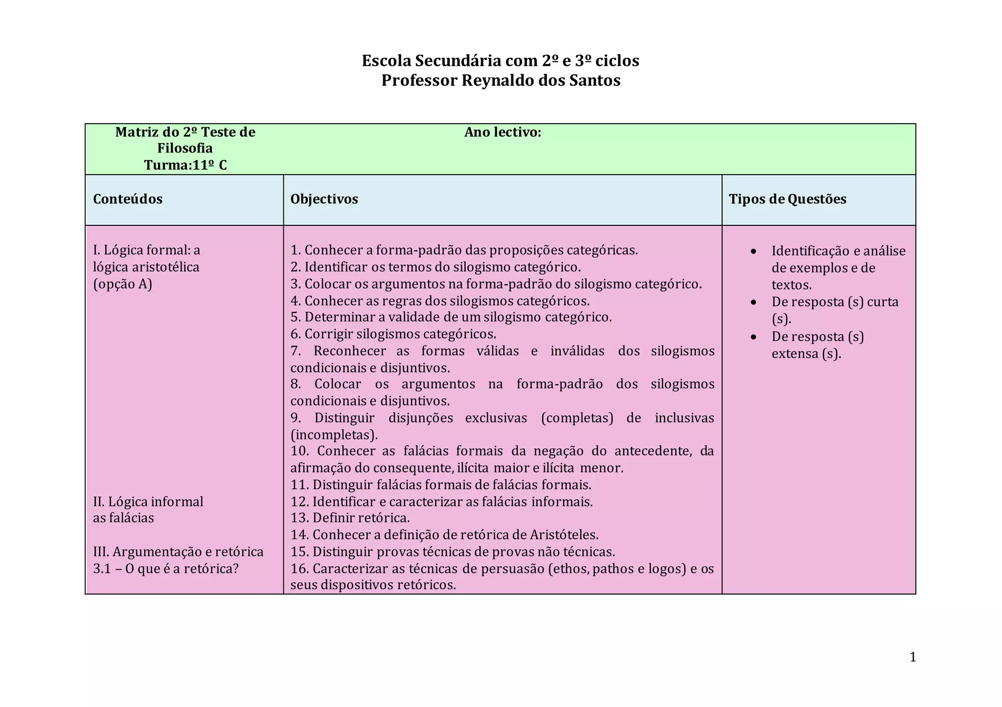 Este documento apresenta a matriz de um teste de Filosofia para alunos do 11o ano. A matriz descreve três seções principais: (1) Lógica formal, focando na lógica aristotélica; (2) Lógica informal e falácias; e (3) Argumentação e retórica, incluindo a definição de retórica segundo Aristóteles e as técnicas de persuasão.