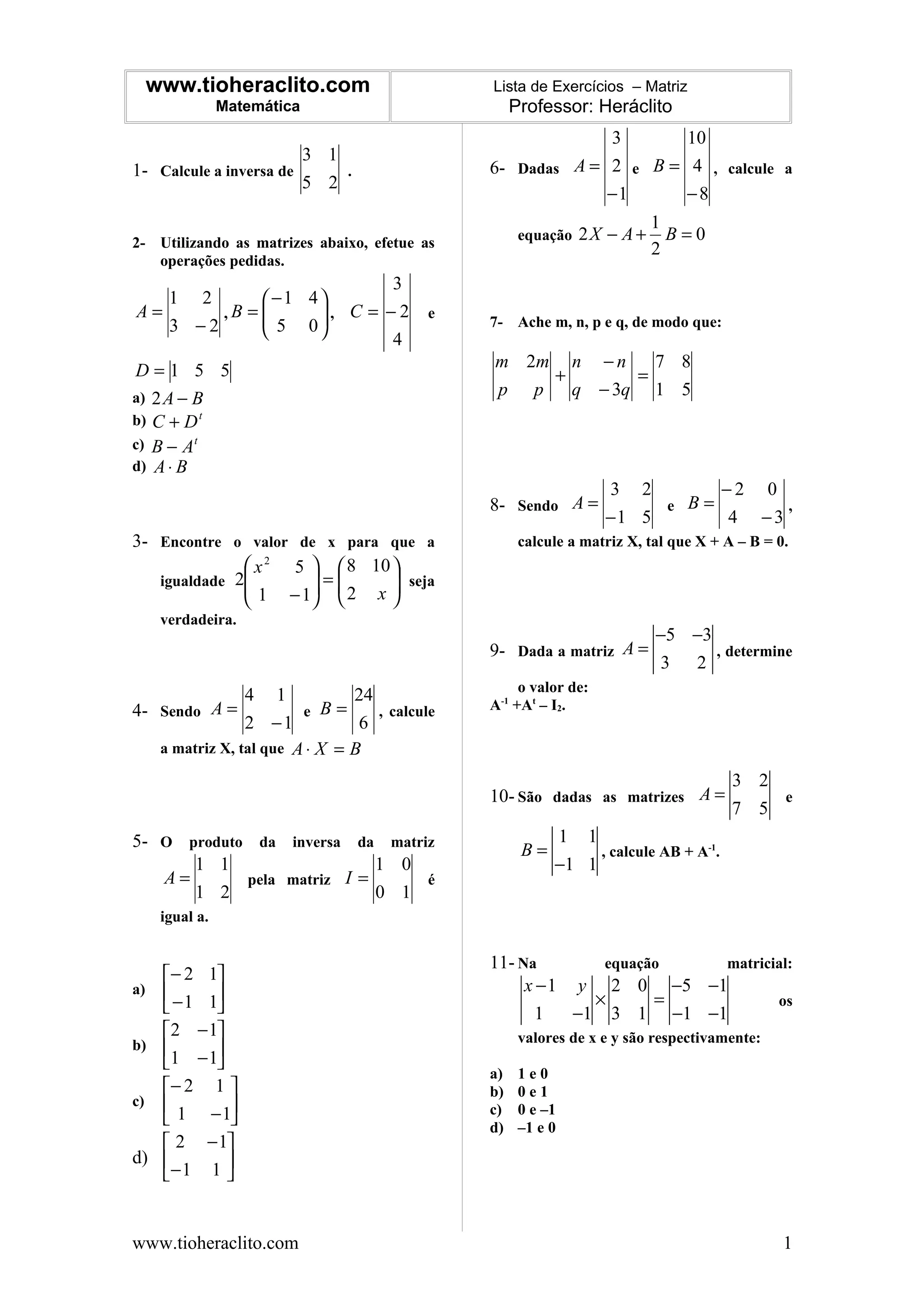 Este documento apresenta 20 exercícios de álgebra linear envolvendo operações com matrizes, cálculo de determinantes e resolução de equações lineares. Os exercícios abordam tópicos como cálculo da inversa de matrizes, multiplicação e soma de matrizes, igualdade de matrizes e resolução de sistemas lineares através de matrizes e determinantes.