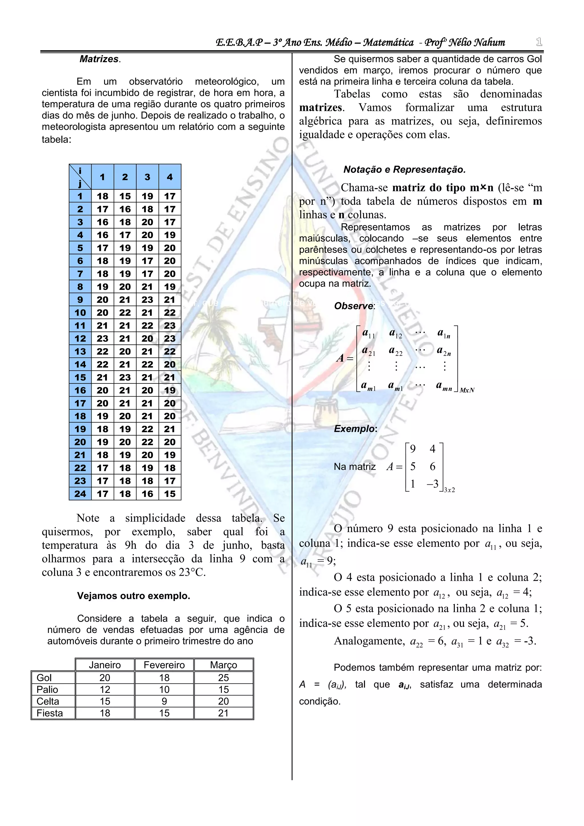 1) O documento apresenta os conceitos básicos de matrizes, incluindo sua notação e representação.