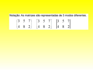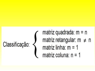 O documento descreve conceitos básicos sobre matrizes, incluindo: (1) matrizes são tabelas formadas por linhas e colunas; (2) exemplos de matrizes retangulares e quadradas; (3) elementos de uma matriz genérica; (4) tipos especiais de matrizes como linha, coluna, nula, triangular, diagonal, identidade, transposta, simétrica.
