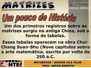 O documento descreve a história e aplicações das matrizes, começando pela sua origem na antiga China e evoluindo até o uso moderno. Aborda conceitos como tipos de matrizes, elementos, operações e propriedades.