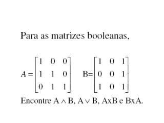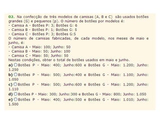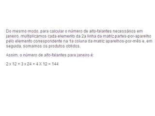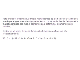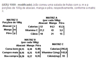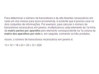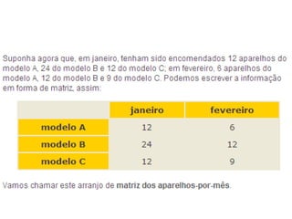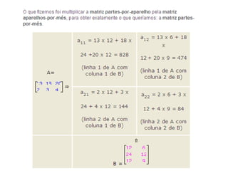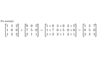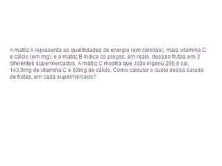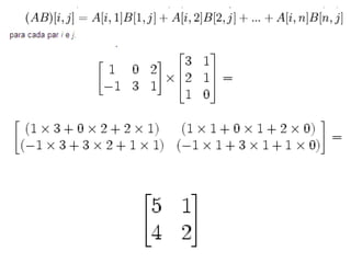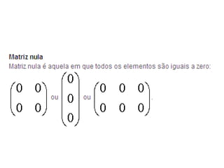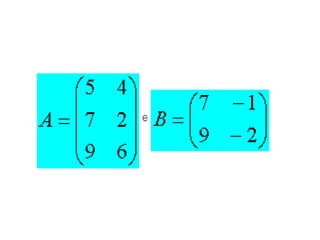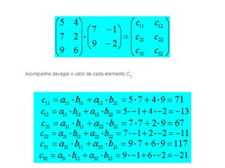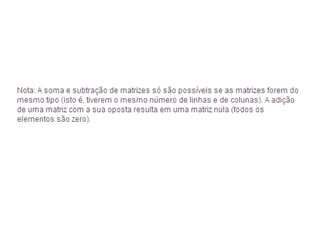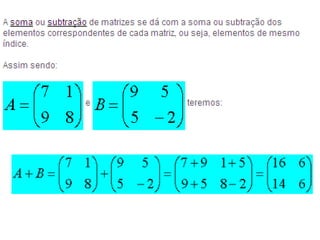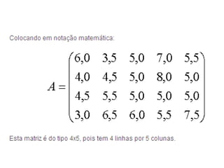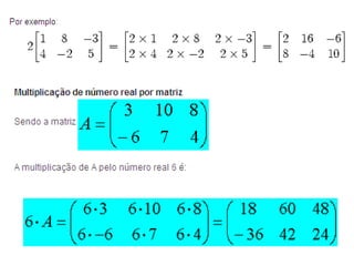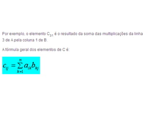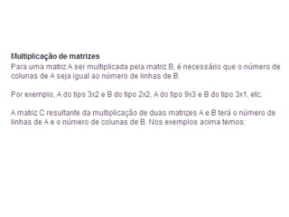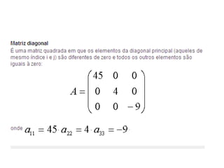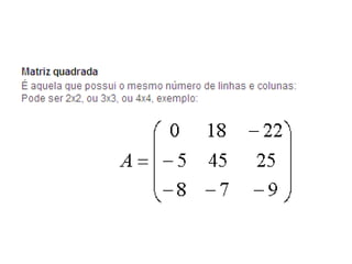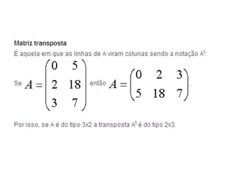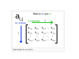 Este documento descreve as características básicas de matrizes, incluindo suas dimensões, elementos, transposição e operações como adição, subtração e multiplicação. Matrizes podem ser quadradas ou retangulares, e vetores são considerados matrizes de dimensão especial.