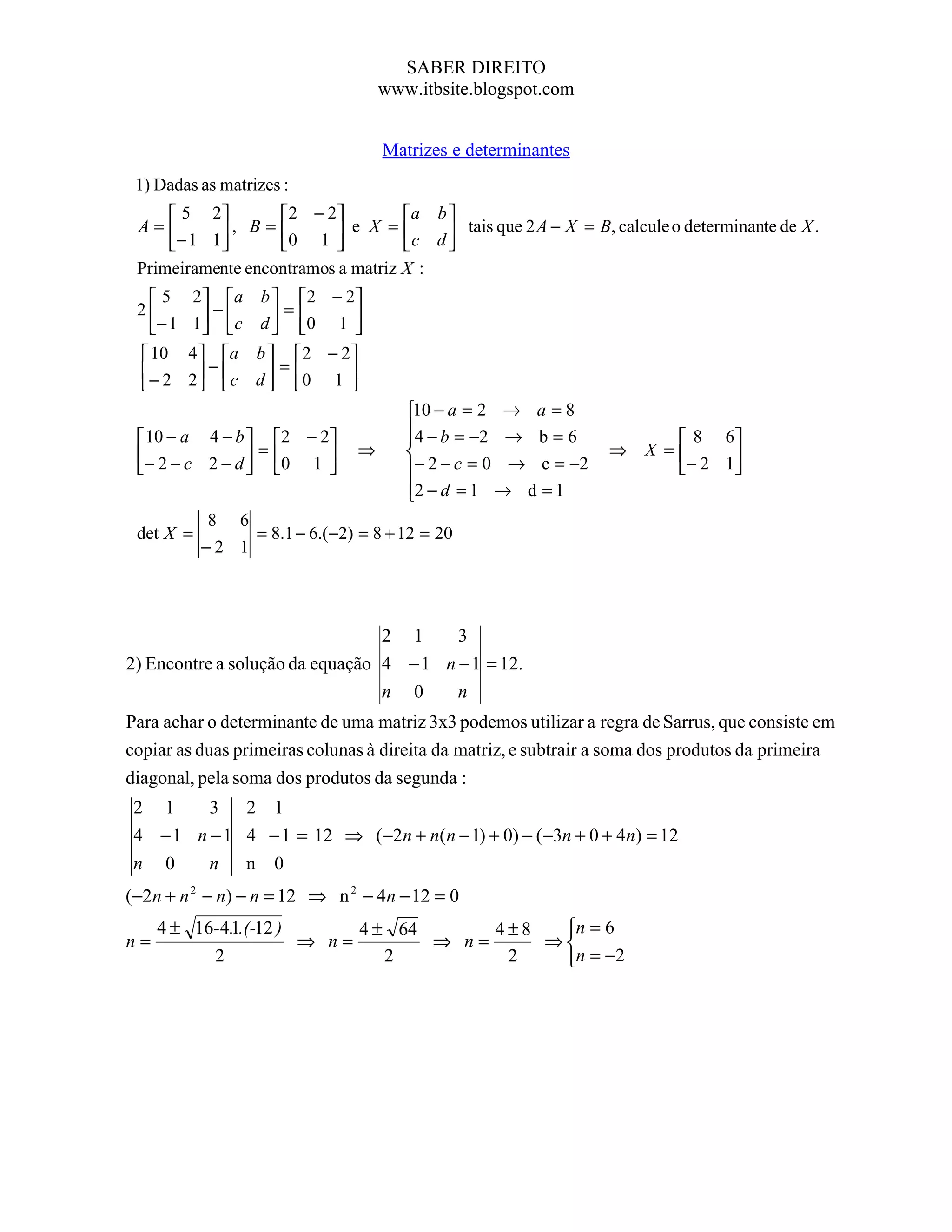 O documento discute matrizes e determinantes. Ele apresenta 4 exemplos numéricos que envolvem calcular o determinante de uma matriz dada equações entre matrizes, encontrar soluções de equações envolvendo determinantes, calcular o produto de duas matrizes e determinar a inversa de uma matriz.