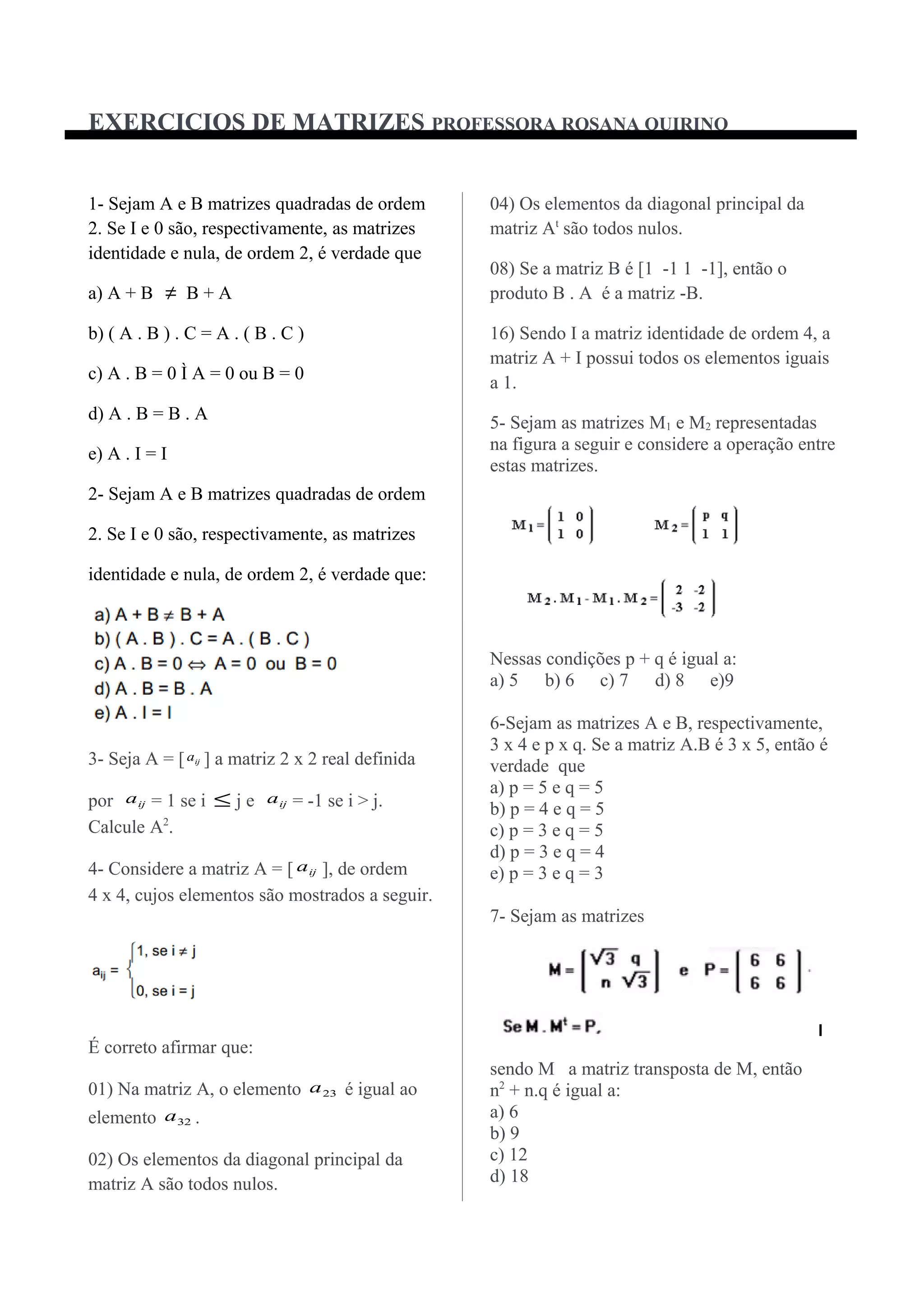 Este documento apresenta 14 exercícios sobre operações com matrizes. Os exercícios abordam tópicos como soma, multiplicação, transposta e inversa de matrizes quadradas e retangulares de diferentes ordens. Há também questões sobre interpretação de elementos de matrizes e resolução de equações matriciais.