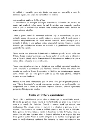 Max Weber nasceu na Prússia em 1864 e se tornou um importante sociólogo, economista e filósofo. Sua epistemologia defendia que o conhecimento está ligado aos valores do pesquisador, mas ainda assim é possível alcançar um conhecimento objetivo. Sua sociologia enfatizava a análise da ação social individual e como ela configura a sociedade, rejeitando estruturas sociais pré-determinadas.