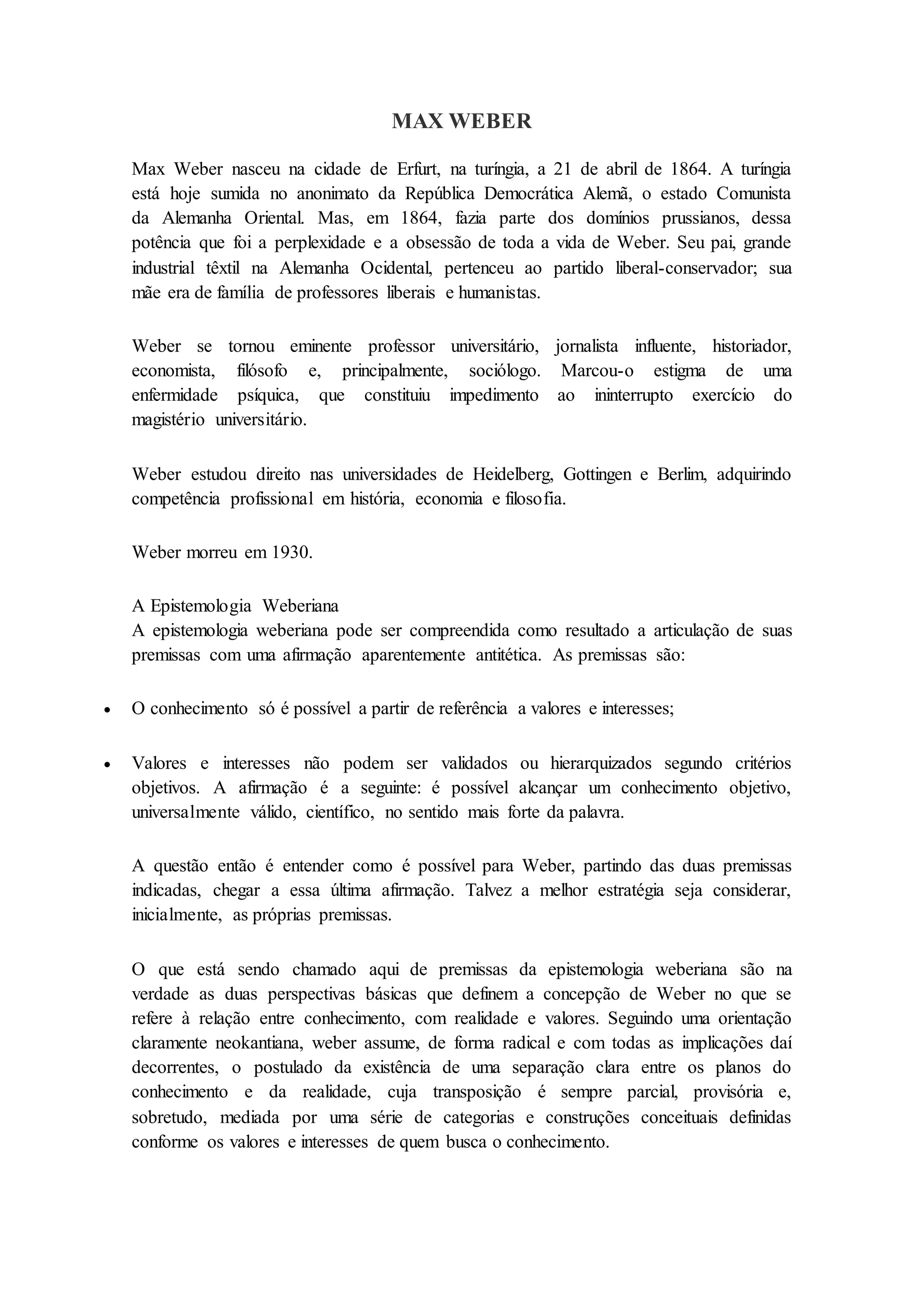 Max Weber nasceu na Prússia em 1864 e se tornou um importante sociólogo, economista e filósofo. Sua epistemologia defendia que o conhecimento está ligado aos valores do pesquisador, mas ainda assim é possível alcançar um conhecimento objetivo. Sua sociologia enfatizava a análise da ação social individual e como ela configura a sociedade, rejeitando estruturas sociais pré-determinadas.
