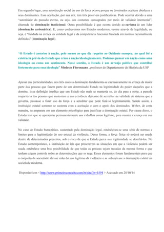 Max Weber definiu o Estado como um aparato que detém o monopólio da violência legítima dentro de um território, com base na crença dos indivíduos em sua legitimidade. Segundo Weber, a dominação estatal pode ocorrer por tradição, carisma ou legalidade, mas depende sempre da crença da maioria na validade do sistema que governa.