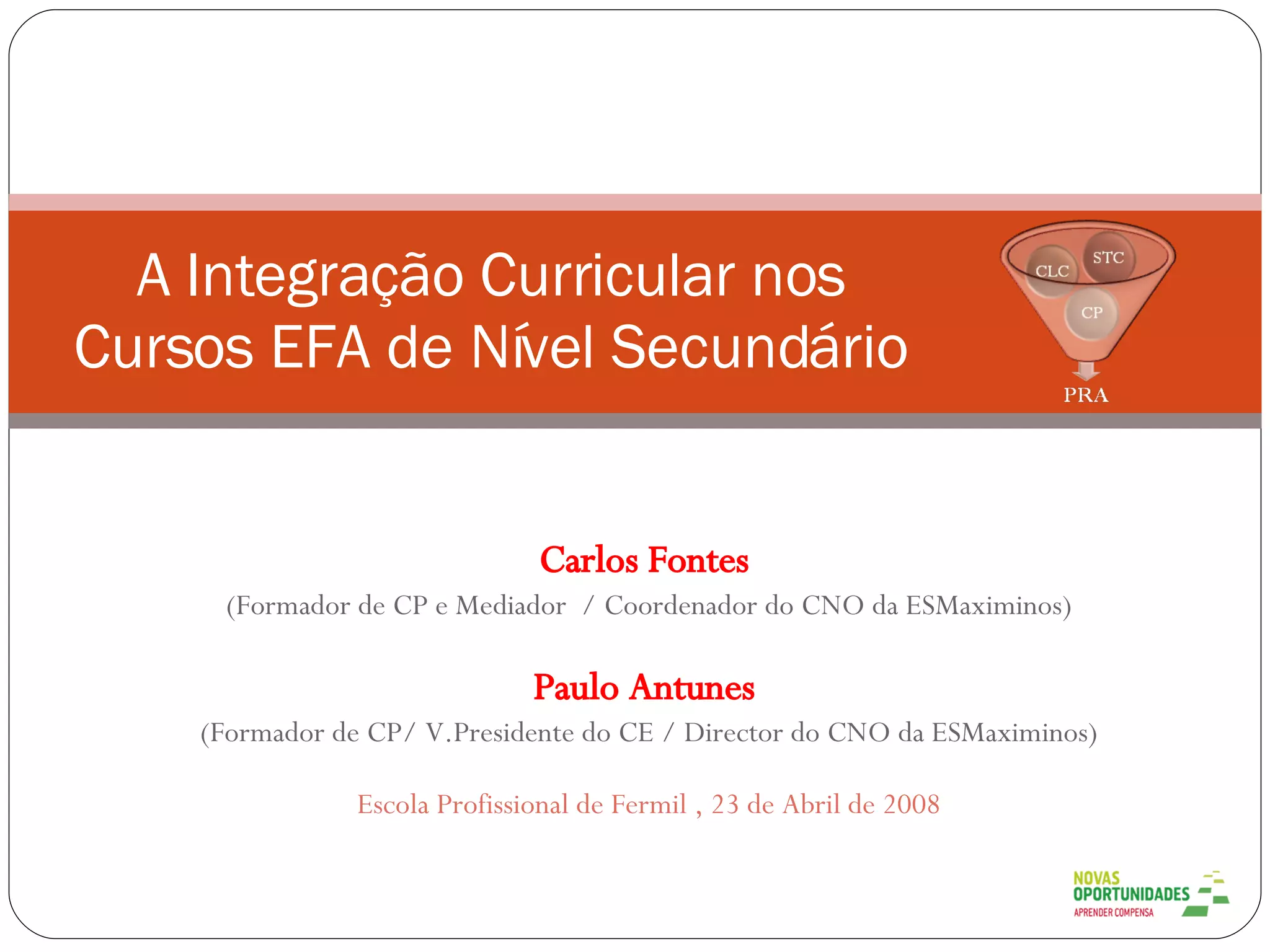 O documento discute a integração curricular nos cursos EFA de nível secundário. Apresenta o processo de seleção e organização de turmas, incluindo entrevistas e dinâmicas de grupo. Também discute a importância da co-docência entre formadores e fornece exemplos de atividades integradoras entre diferentes áreas do currículo, como a elaboração de uma brochura sobre consciência ambiental.