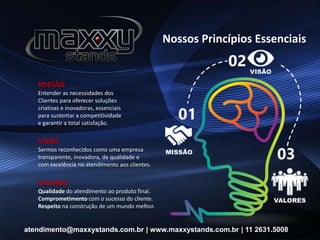 A Maxxy Stands oferece soluções criativas e inovadoras para estandes em eventos. A empresa opera há mais de 8 anos com foco em entender as necessidades dos clientes e oferecer atendimento de qualidade. A Maxxy Stands também se compromete com a sustentabilidade e responsabilidade social.