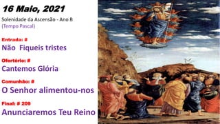 O documento fornece detalhes sobre uma solenidade da Ascensão, incluindo hinos, leituras e orações. O documento celebra a ascensão de Jesus aos céus e a vinda do Espírito Santo.