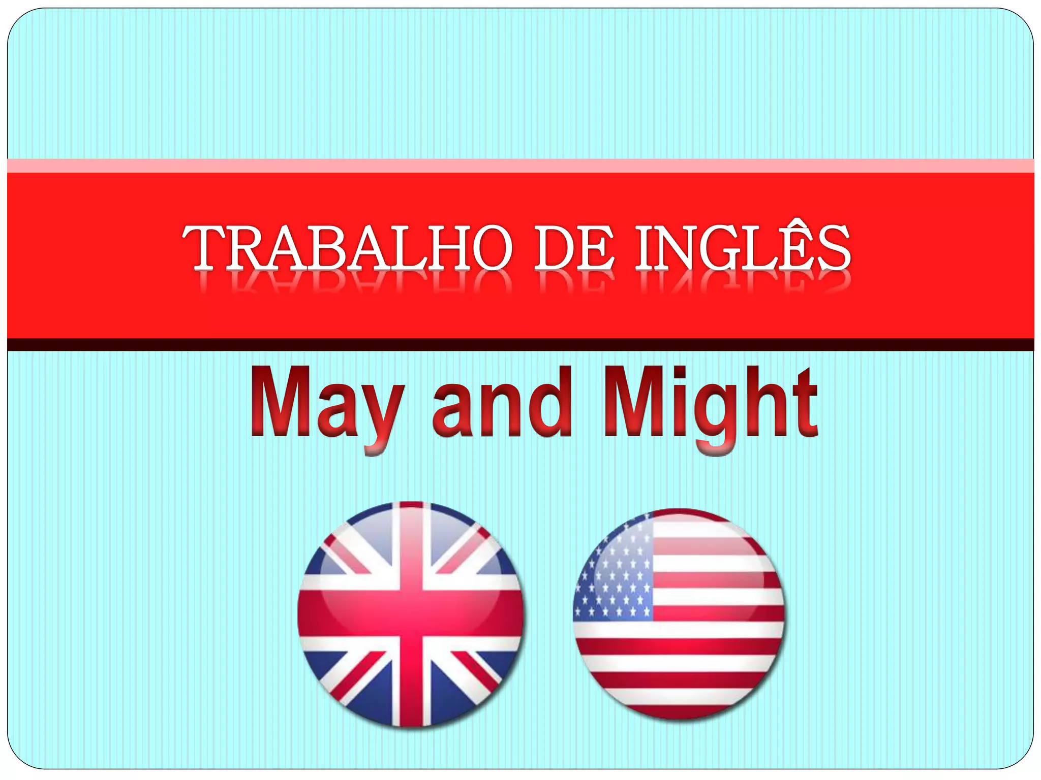 O documento discute os verbos modais may e might em inglês. Ambos indicam possibilidade ou permissão, com may significando "pode" e might significando "poderia". May é usado para expressar possibilidades no presente ou futuro, enquanto might é usado para possibilidades no passado ou presente, mas de forma mais fraca que may.