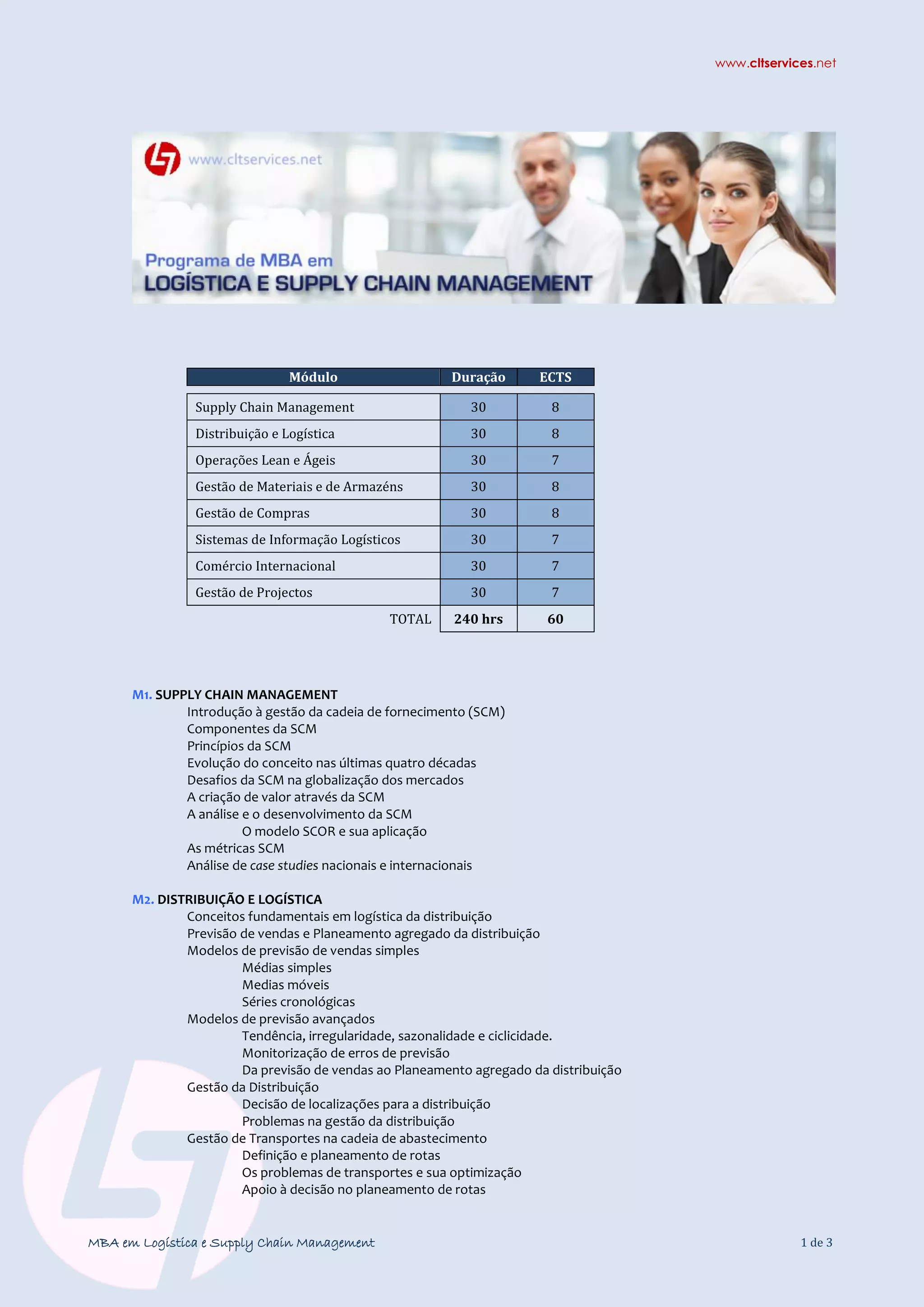 O documento apresenta um currículo de um MBA em Logística e Supply Chain Management, detalhando módulos como Gestão da Cadeia de Fornecimento, Distribuição e Logística, Operações Lean e Ágeis, Gestão de Materiais, Compras, Sistemas de Informação Logísticos, Comércio Internacional e Gestão de Projetos. Cada módulo cobre teorias e práticas essenciais, com ênfase em análise de estudos de caso e aplicações em contextos reais. O total do curso soma 240 horas, proporcionando uma formação abrangente na área.