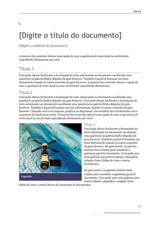 O documento discute como formatar texto e inserir elementos em um documento de forma a coordenar a aparência geral do mesmo. Ele explica que é possível alterar o formato de texto selecionado usando estilos rápidos ou diretamente usando ferramentas de formatação, e que elementos inseridos como imagens e gráficos também são coordenados com o tema do documento.