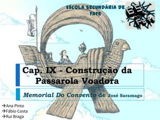 Este capítulo descreve a mudança de Baltasar e Blimunda para a quinta do Duque de Aveiro para trabalhar na construção da máquina voadora do Padre Bartolomeu Lourenço. Blimunda auxilia na construção usando sua habilidade de ver dentro dos materiais. O Padre anuncia que parte para a Holanda em busca de éter para fazer a máquina voar. Após a partida do Padre, o casal decide ir para Mafra.