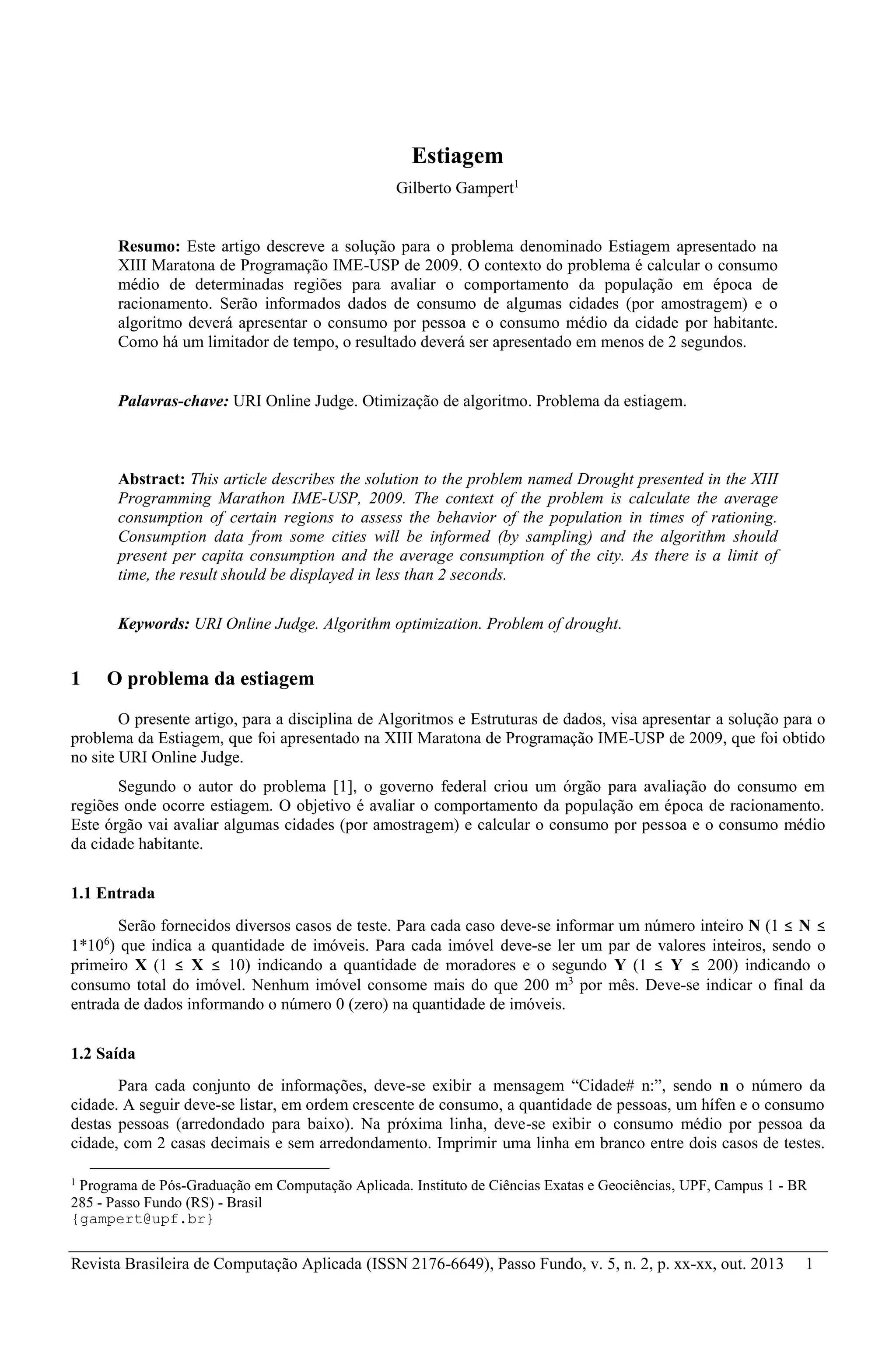 Este artigo apresenta a solução para o problema da estiagem, que envolve o cálculo do consumo médio em regiões durante racionamento, conforme proposto na maratona de programação IME-USP de 2009. O algoritmo deve processar dados de consumo de imóveis e apresentar os resultados em menos de 2 segundos, cumprindo restrições de consumo e população. Duas abordagens foram testadas, sendo a segunda, que utiliza um vetor pré-alocado, mais eficiente para atender ao limite de tempo.