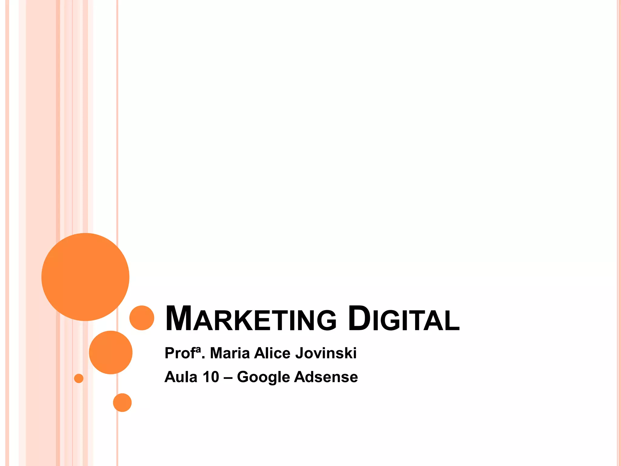 O documento discute o Google AdSense, que permite aos proprietários de sites exibirem anúncios de texto, imagens e vídeos em suas páginas. Os anunciantes pagam aos proprietários de sites sempre que os usuários clicam nos anúncios ou quando eles são exibidos. O AdSense oferece vários formatos de anúncios e ferramentas para relatórios e otimização.
