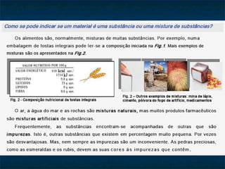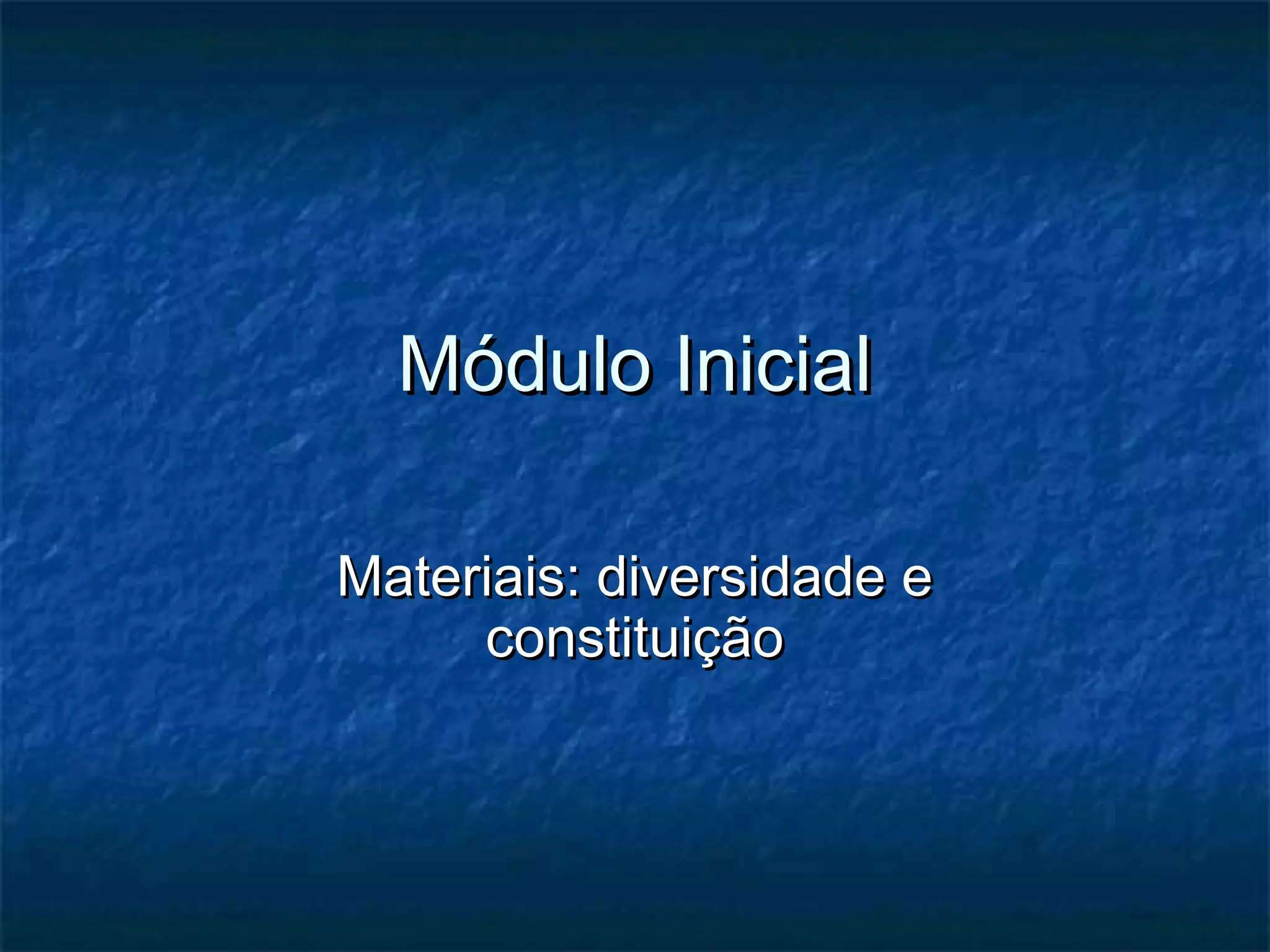 O documento discute a diversidade de materiais, sua classificação e constituição. Materiais podem ser naturais ou sintéticos e são classificados como substâncias puras ou misturas. Misturas podem ser homogêneas, heterogêneas ou coloidais dependendo de sua aparência e estrutura a nível microscópico. A constituição dos materiais envolve átomos, moléculas ou íons.