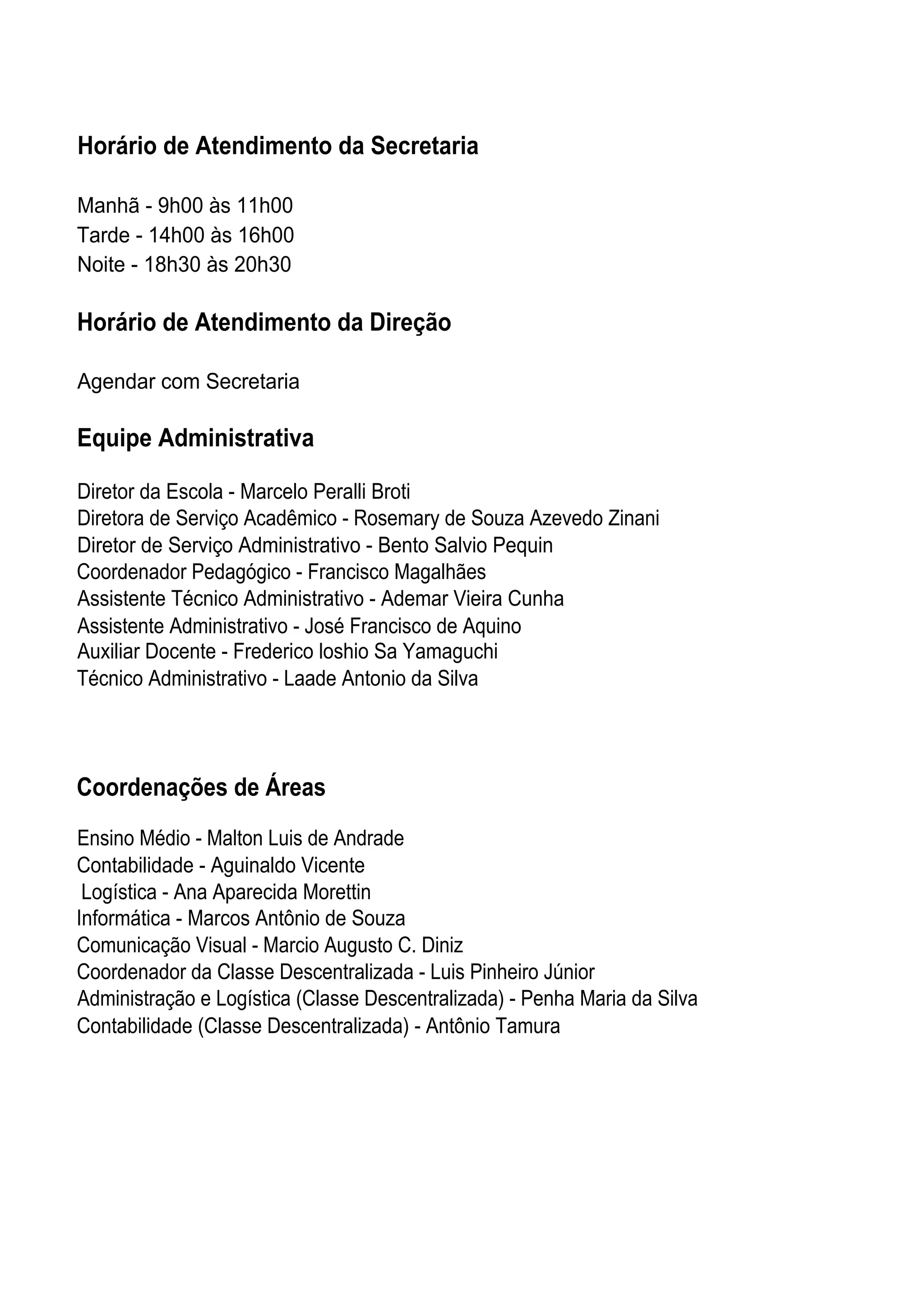 Este documento fornece informações sobre o horário de atendimento da secretaria e direção, equipe administrativa, missão da escola, políticas de avaliação, frequência, promoção, retenção, reclassificação, dispensa de educação física, matrícula, aproveitamento de estudos e transferência de uma escola técnica.