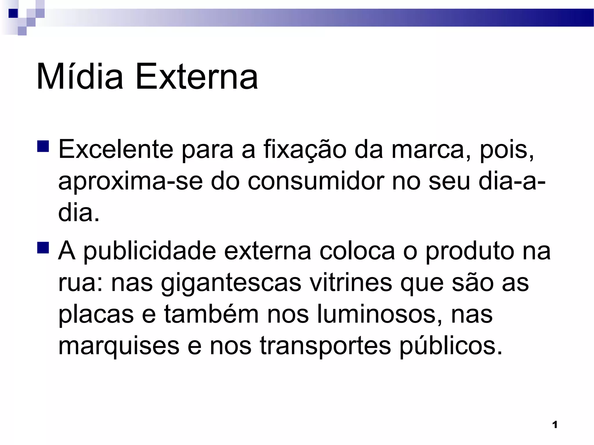 O documento discute diferentes tipos de mídia externa, incluindo placas, outdoors e transporte público, que aproximam as marcas dos consumidores no dia a dia. O outdoor é eficaz por causar impacto através do tamanho e repetição dos cartazes, porém requer grandes investimentos. A mídia eletrônica como TV e cinema é lembrada com mais facilidade pelo público por combinar áudio e vídeo.